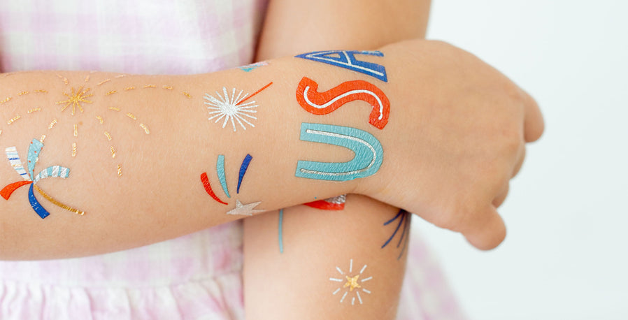 It's a party in the U.S of yay! Featuring festive summer colors and silver and gold foil accents, these cut-out tattoos are perfect for celebrating the Fourth of July!